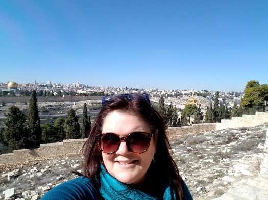 I, on the other hand, am still a pilgrim on a journey without details of where it will lead. For today, it led first to where I could, as Jesus did, look over the city of Jerusalem to see where the Temple Mount had been and where today stands the Dome of the Rock (gold dome over my left shoulder) and the Church of St. Mary Magdalene (gold domes over my right shoulder)…(hmmm, that’s a lot of gold over my head and shoulders – pun could not be resisted).